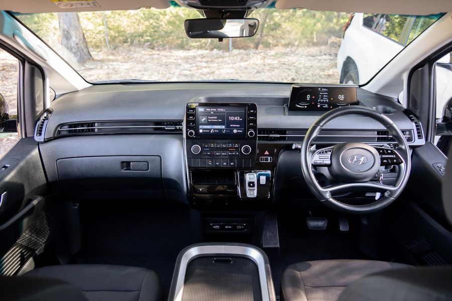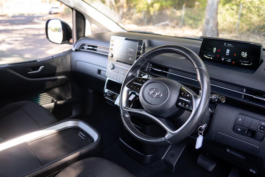 Inside, the STARIA offers a spacious and versatile cabin with flexible seating configurations, modern infotainment, and advanced safety technology.