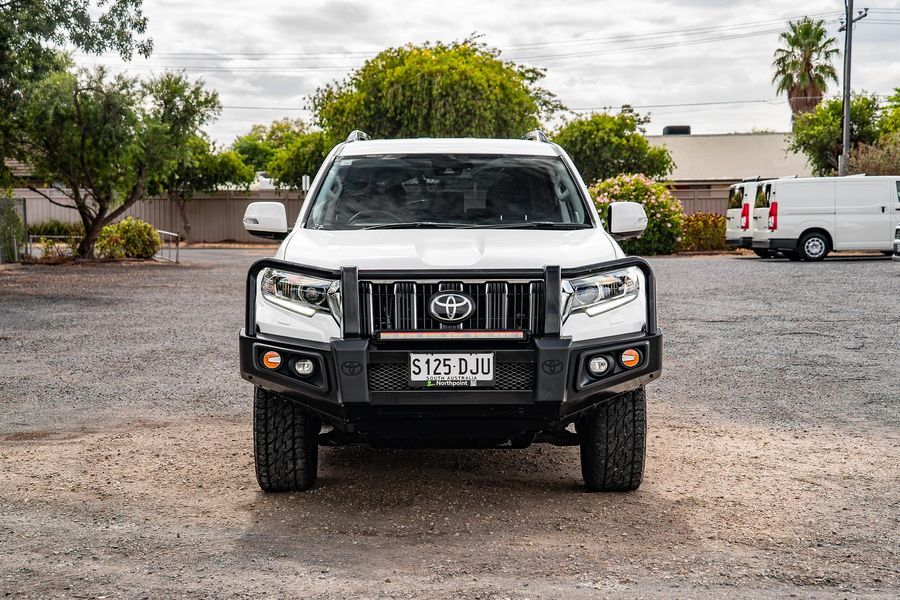 Experience dependable off-road capability and spacious family versatility with this white 2022 Toyota LandCruiser Prado GXL, with 91,000 kilometres travelled and fitted with a bull bar for added protection.